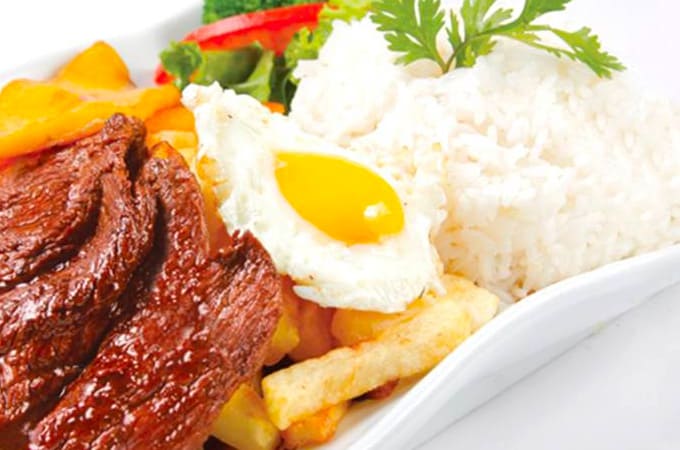 Se prepara con un bistec de res a la plancha, cocido al punto ideal para conservar su jugosidad y realzar su sabor natural. Sobre él se coloca un huevo frito de yema dorada, que al romperse baña el plato con su textura cremosa. Acompañan la preparación un arroz blanco graneado, papas nativas bien doradas que aportan crocancia y una ensalada fresca que equilibra los sabores salados del conjunto.